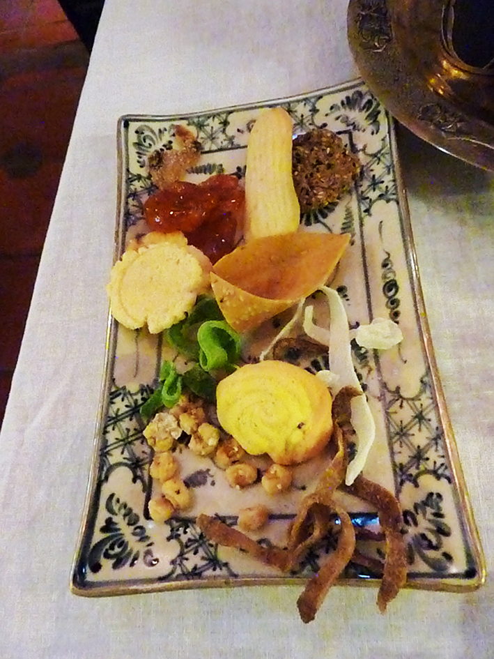 Preserved tangerine, coffee and pandan-soaked coconut, lotus seeds and cookies at Reaching Out Tea House in Hoi An